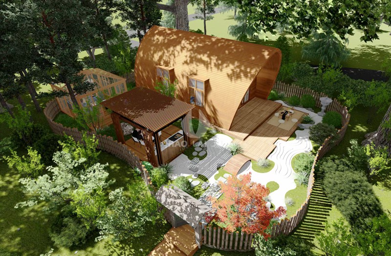 船屋設(shè)計(jì)最大的特點(diǎn)是外觀融于自然,內(nèi)部簡(jiǎn)單樸素,遵循有所為,有所不為原則,保證景觀的合理性、舒適性,結(jié)合周邊環(huán)境,以船屋的形式還原村野生活。